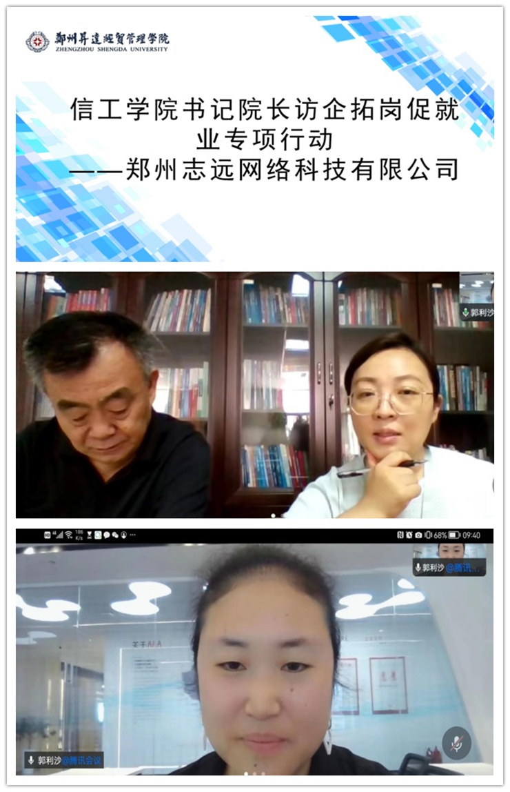 为进一步落实全国高校书记董事长访企拓岗促就业专项行动要求,公司结合自身专业特性,制定公司的书记经理访企拓岗促就业专项行动,深入落实就业工作“一把手”工程,加强与企业的深度合作,提高毕业生就业质量。5月23日上午9:30,信工公司与郑州志远网络技术有限公司利用腾讯会议在线上召开视频会议。出席会议的有郑州志远网络技术公司负责人郭利沙,信工公司白鑫经理、党委书记张现水、行政秘书王崇老师、教学秘书赵会燕老师以及全体毕业班老师,会议由就业专员宁珂老师主持。