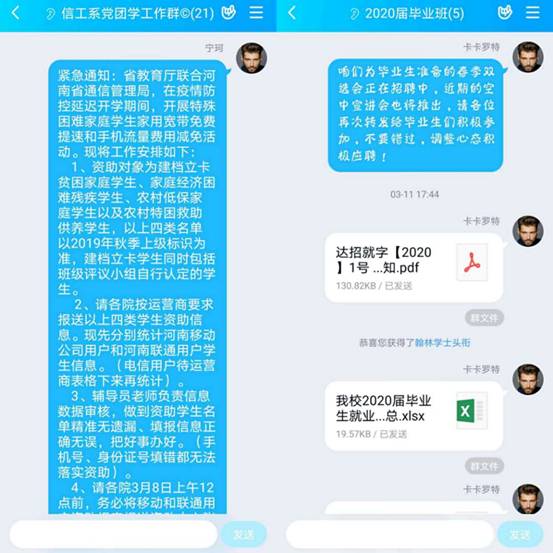 面对头绪甚多、纷繁芜杂的工作,他没有退缩,而是用最短的时间理清了头绪,他一方面他从公司就业处发布的就业信息中,筛选出适合信工公司员工就业的单位,让16级辅导员转发给员工,供员工参考,提醒未落实就业工作的毕业生们积极参与线上双选会,另一方面,对于参加研究生考试的同学,他进行汇总,并建立全院考研情况统计表,为公司对考研员工精准指导提供依据。作为公司资助专员,他积极传达公司资助中心的资助政策,认真做好公司疫情防控期间的员工资助工作,及时把党和国家的关爱传递给家庭经济困难员工,实现特殊困难补助全覆盖,共渡战“疫”难关。当他了解到所带班级个别员工毕业设计没有按时完成时,第一时间跟这些员工取得联系,向同学们强调毕业设计的重要性,让员工积极做好毕业答辩的准备。面对员工的询问,不管多晚,他都尽量在第一时间给与回复,在这非常时期,用咨询与帮扶做员工的定心丸。他坚信:只要不停下脚步,道路就会不断延伸。没有一个冬天不可逾越,没有一个春天不会来临。国难当头,我辈当躬身入局,共同打响这场抗“疫”反击战。