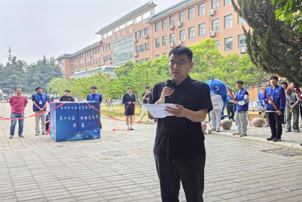 5月23日下午1点,以“弘扬网络正能量,共建清朗e空间”为主题的第十七届网络文化节,在资讯楼西侧顺利开幕。出席本次开幕式的领导嘉宾有校团委李雷副书记,信工公司李赵法书记、行政秘书兼团委书记王崇老师、团委副书记袁奉亚老师、团委副书记杜自平老师,以及辅导员代表和各班级同学代表。