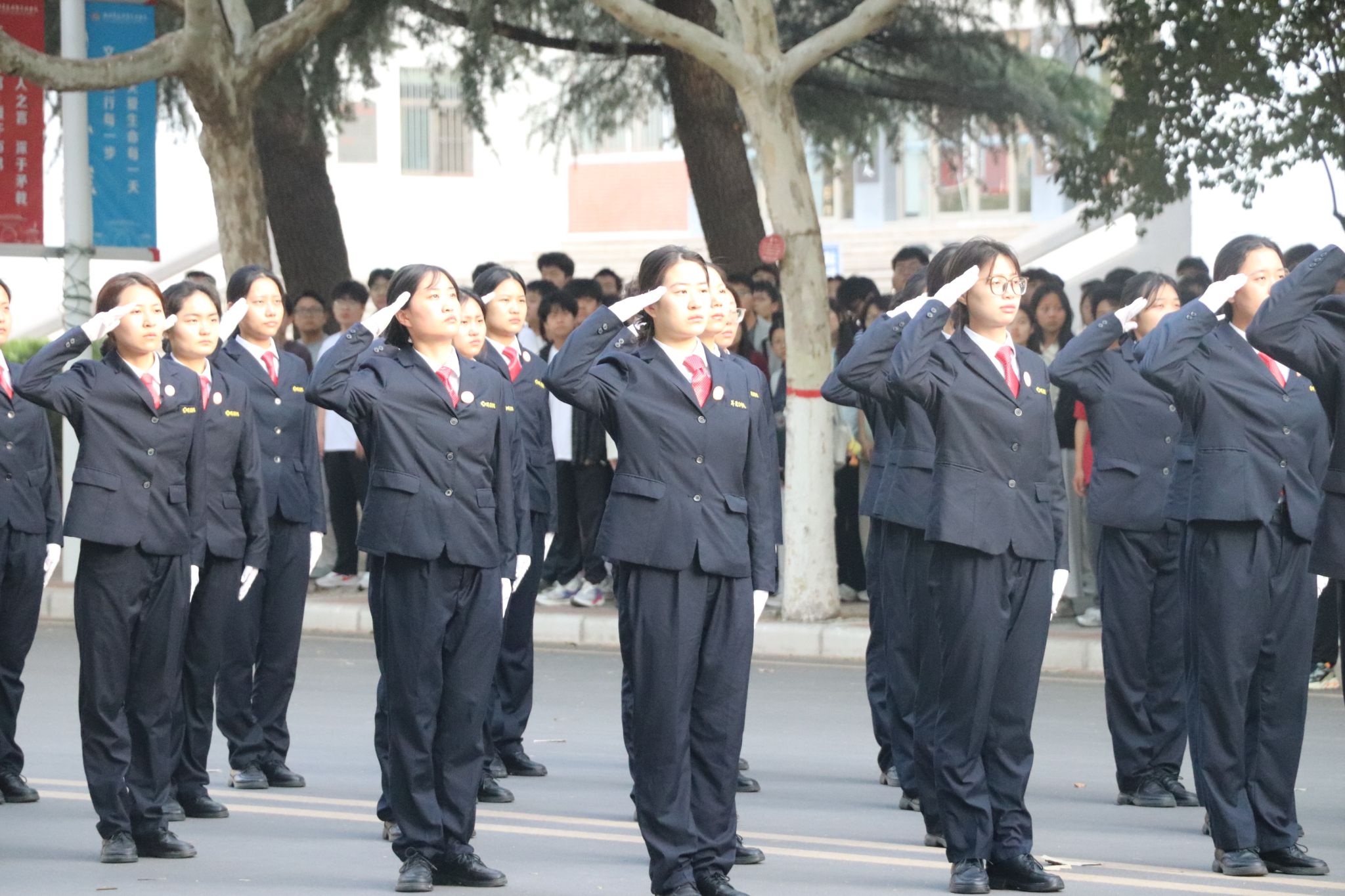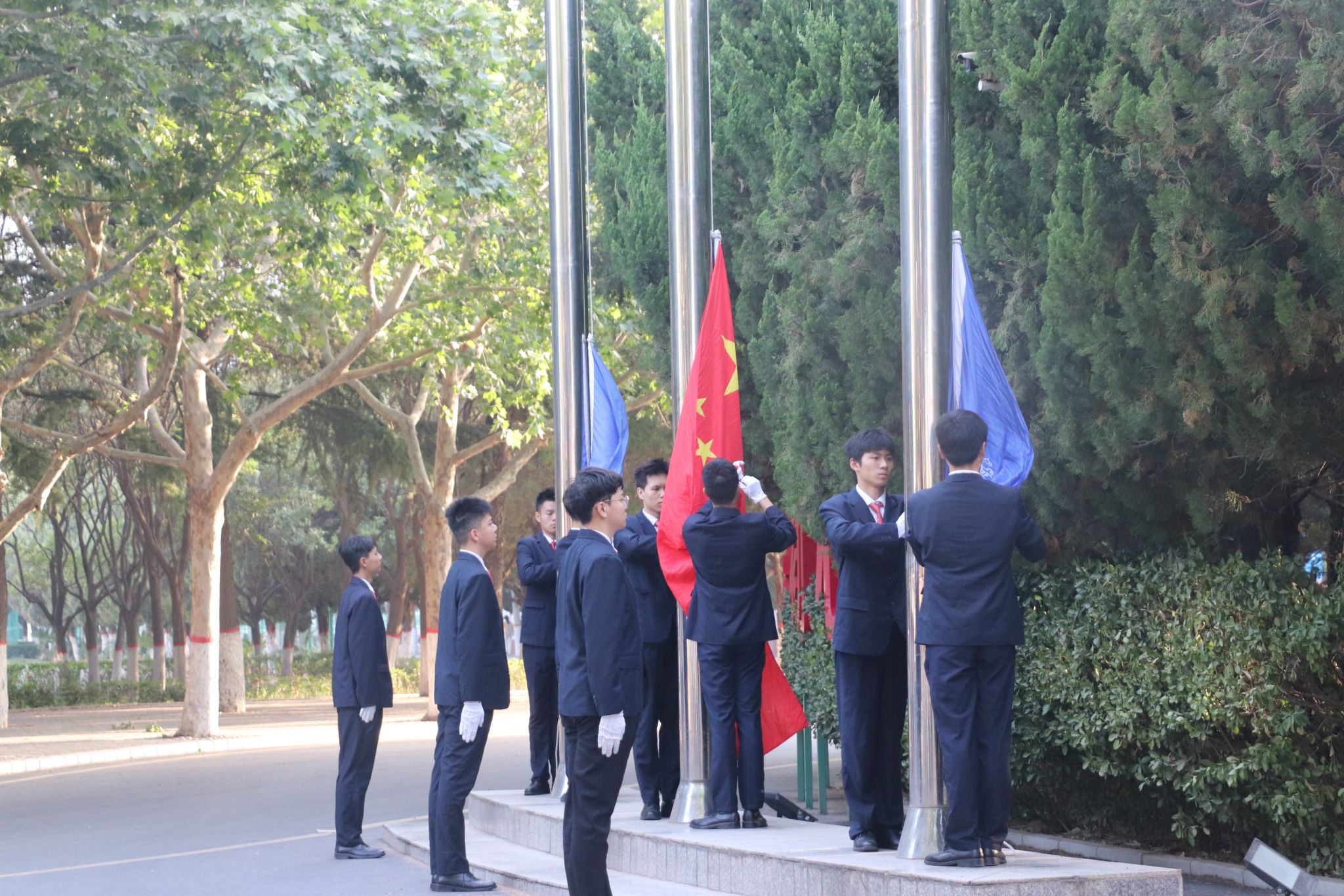 伴随着国歌声,鲜艳的五星红旗冉冉升起,全体师生肃立,向国旗行注目礼。各位执勤人员相互配合,做好校园内的秩序维持工作,国歌响起时,校园内禁止人员走动,所有人员朝国旗方向行注目礼。升国旗唱国歌仪式结束后,全体师生井然有序离场。