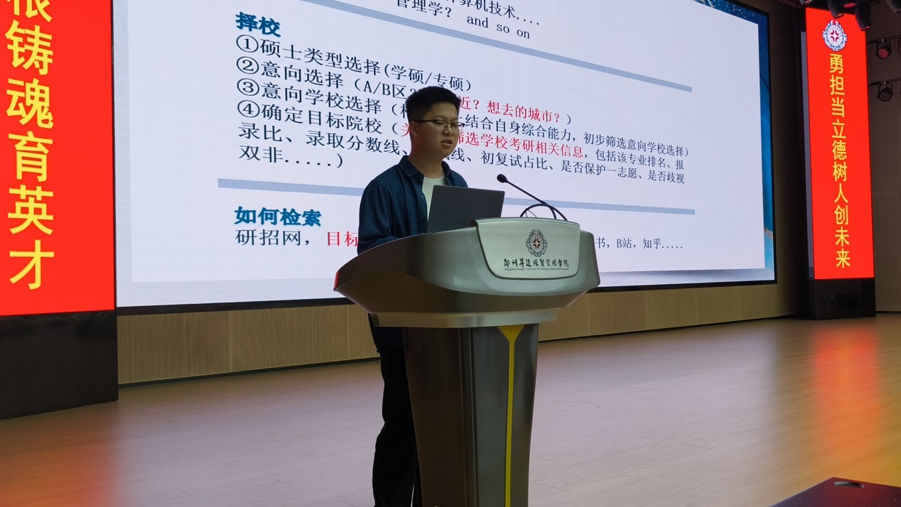 经验分享环节将活动推向高潮。21级大数据1班张宬焯同学(考取上海海洋大学计算机技术专业)分享了备考时间管理与学科攻坚技巧;21大数据2班孙浩亮同学(考取湖北大学人工智能专业)介绍了专业课复习策略与心态调整方法;21级计科3班尹鹏力同学(考取了高级信息系统项目管理师)解读了考证知识体系构建与应试技巧。三位学长的分享干货满满,引发在场同学的强烈共鸣与积极互动。