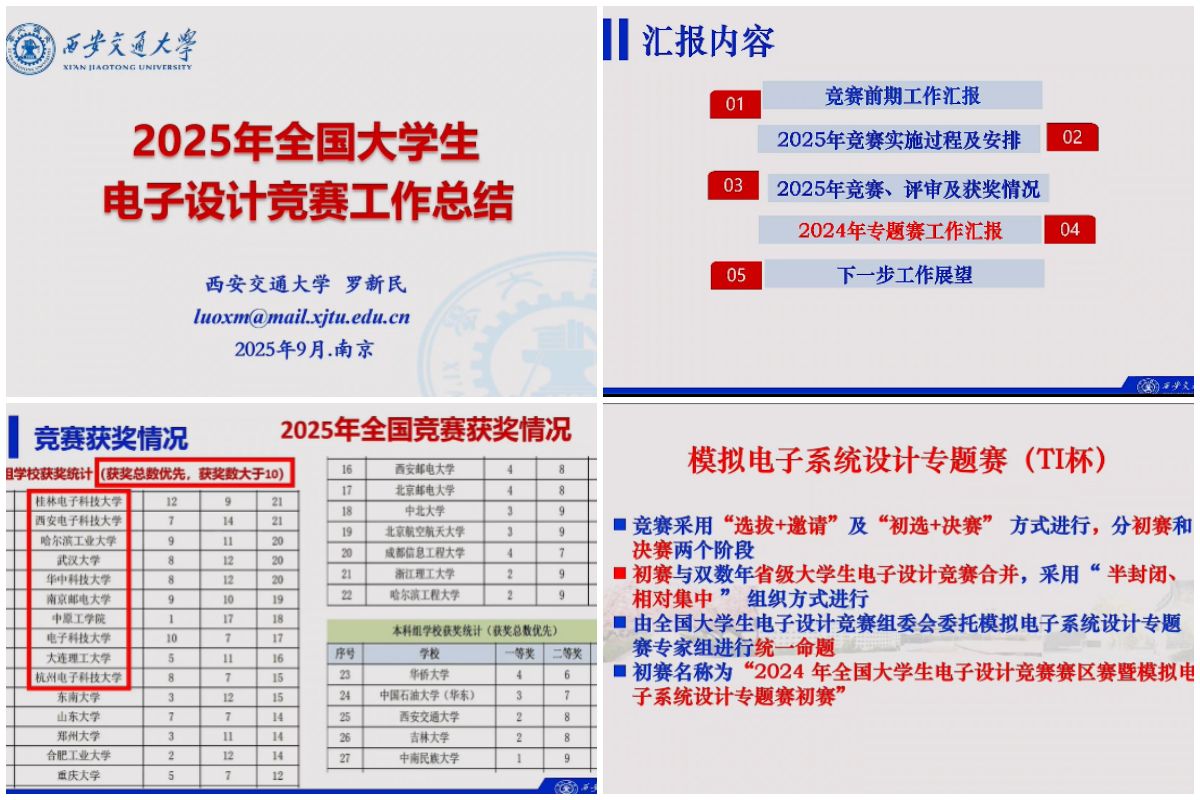会上,西安交通大学的罗新民教授对2025年全国老员工电子设计竞赛组织工作进行了总结报告。同济大学的岳继光教授对2025年全国老员工电子设计竞赛专家组工作进行了总结报告。德州仪器中国大学计划部经理王沁以中国大学计划引入做了“TI产品与技术助力全国老员工电子设计竞赛”的报告。