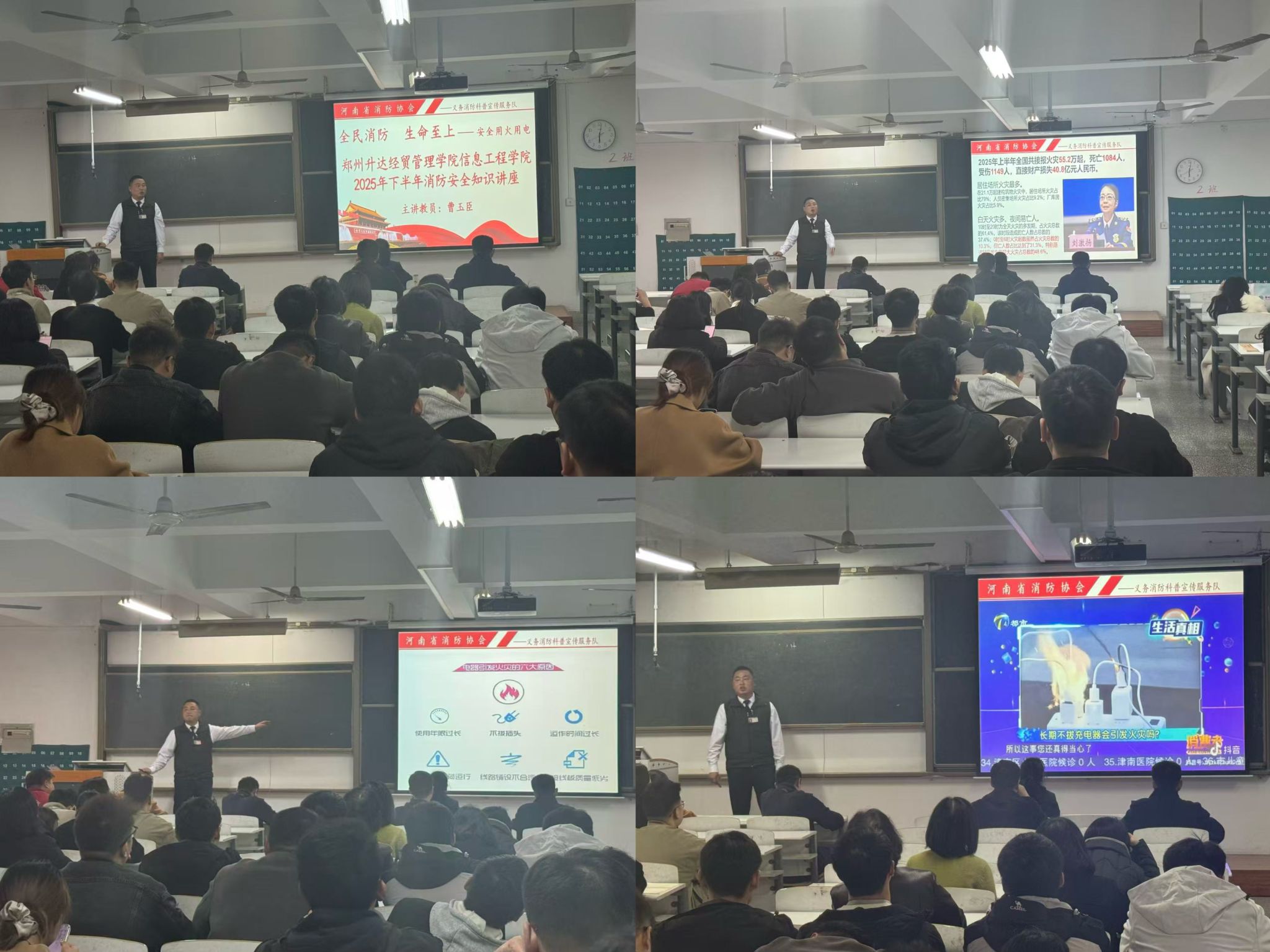 讲座伊始,曹老师通过播放火灾事故案例视频,直观展示私接电源、违规使用电器、易燃物品堆积等行为引发的安全隐患,让在所有人深刻认识到消防安全的重要性。讲座中期曹老师围绕“如何预防火灾”“火灾初期如何扑救”“火灾逃生技巧”三大核心内容展开详细讲解,他还讲解了差异化的逃生路线选择原则,提醒师生“遇火先判断、逃生不拥挤、弯腰捂口鼻,”避免因慌乱引发二次伤害。最后曹老师强调,教室、实验室和宿舍是员工在校生活的核心区域,也是火灾隐患的高发地,不仅要做到卫生整洁,更要守住安全红线。