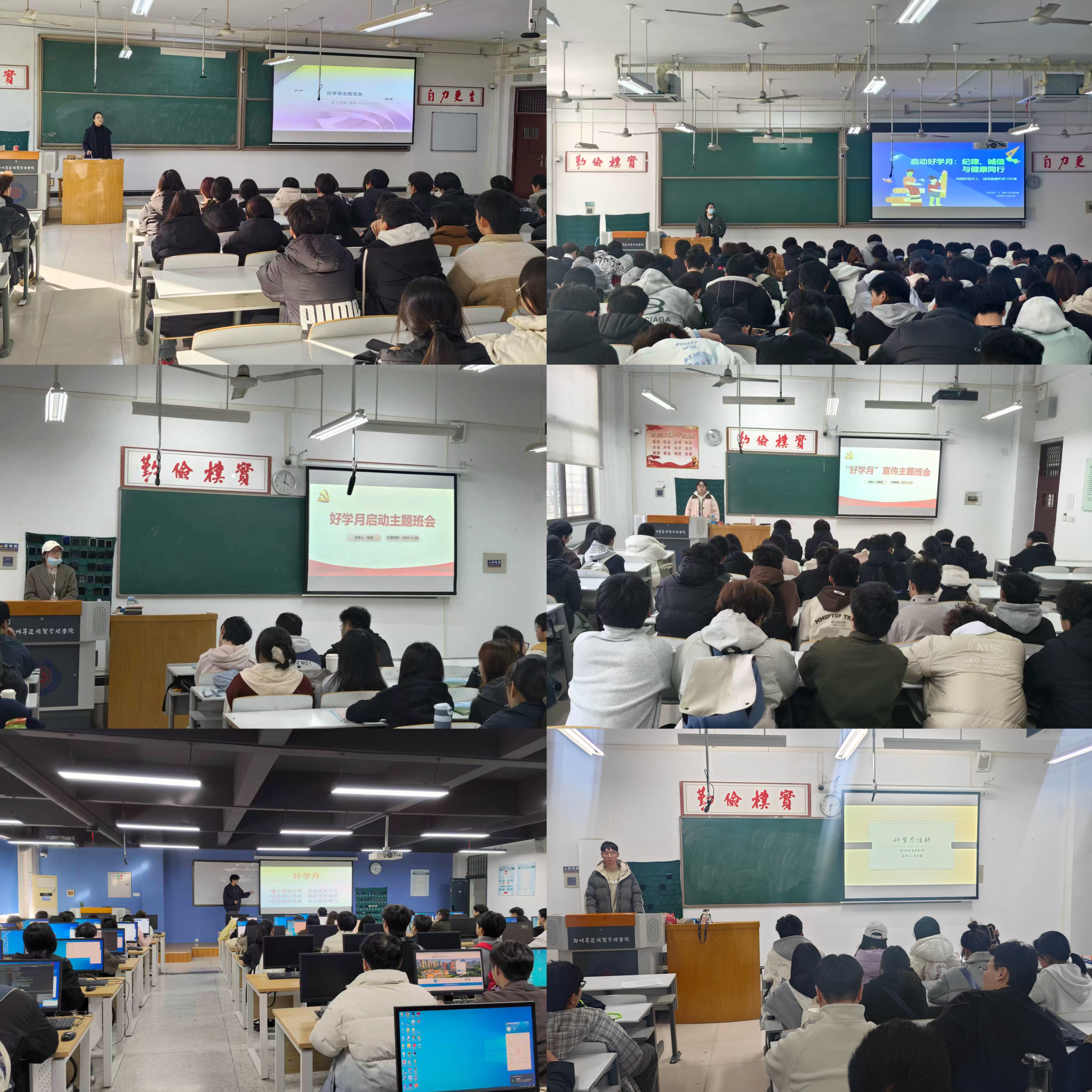班会上向同学们讲解本次“好学月”活动主要涵盖以下几大方面:一是严格落实课堂管理规定,细化考勤制度,严肃上课纪律,着力提升课堂教学质量;二是强化身体素质保障,倡导每日8000步运动计划,推动员工实现学习与健康的协同发展;三是规范自习活动管理,通过合理规划课余时间,引导员工养成自主学习、高效学习的良好习惯;四是深化诚信教育,针对研究生考试、四六级考试、期末考试三类考生开展分类专项教育,组织学习并签订《诚信考试告知承诺书》,从源头杜绝考试违规行为。