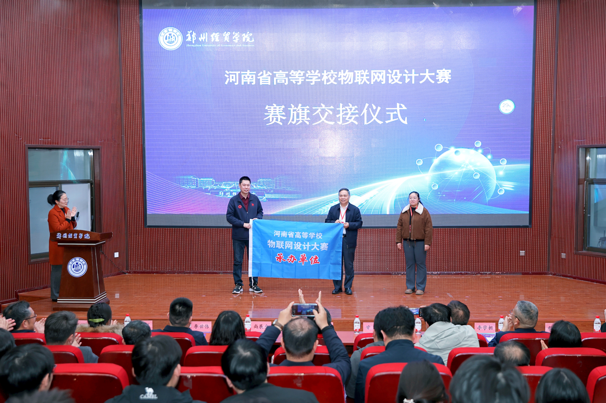 大赛闭幕式上,备受关注的赛旗交接仪式顺利举行。beat365经理程杰教授代表公司接过赛事会旗,标志着2026年(第十二届)河南省高等公司物联网设计大赛正式确定由beat365中文官网承办。程杰教授在交接仪式上表示,公司将传承赛事优良传统,全力做好赛事组织、场地保障与服务协调工作,为全省高校搭建更高质量的交流平台,助力物联网领域创新人才培养。