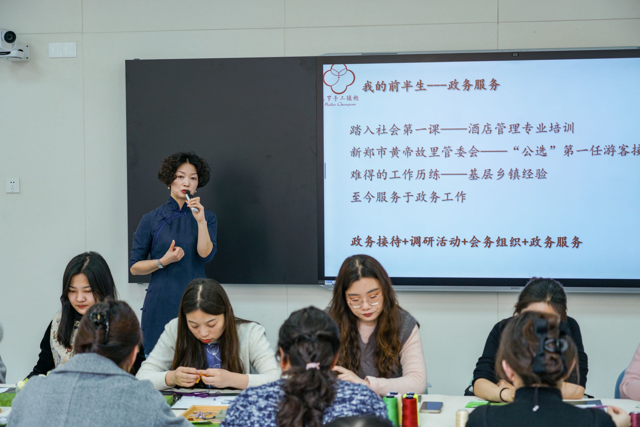 活动特邀美罗手工旗袍工作室主理人周红担任主讲,周红女士以“以非遗之美,绽女性光芒”为主题,讲解了旗袍的形态礼制,梳理了盘扣的发展传承,结合实物展示解读盘扣的造型工艺、和盘扣的绝妙寓意,“旗袍不仅是服饰,更是中国女性独立自信的精神符号”。