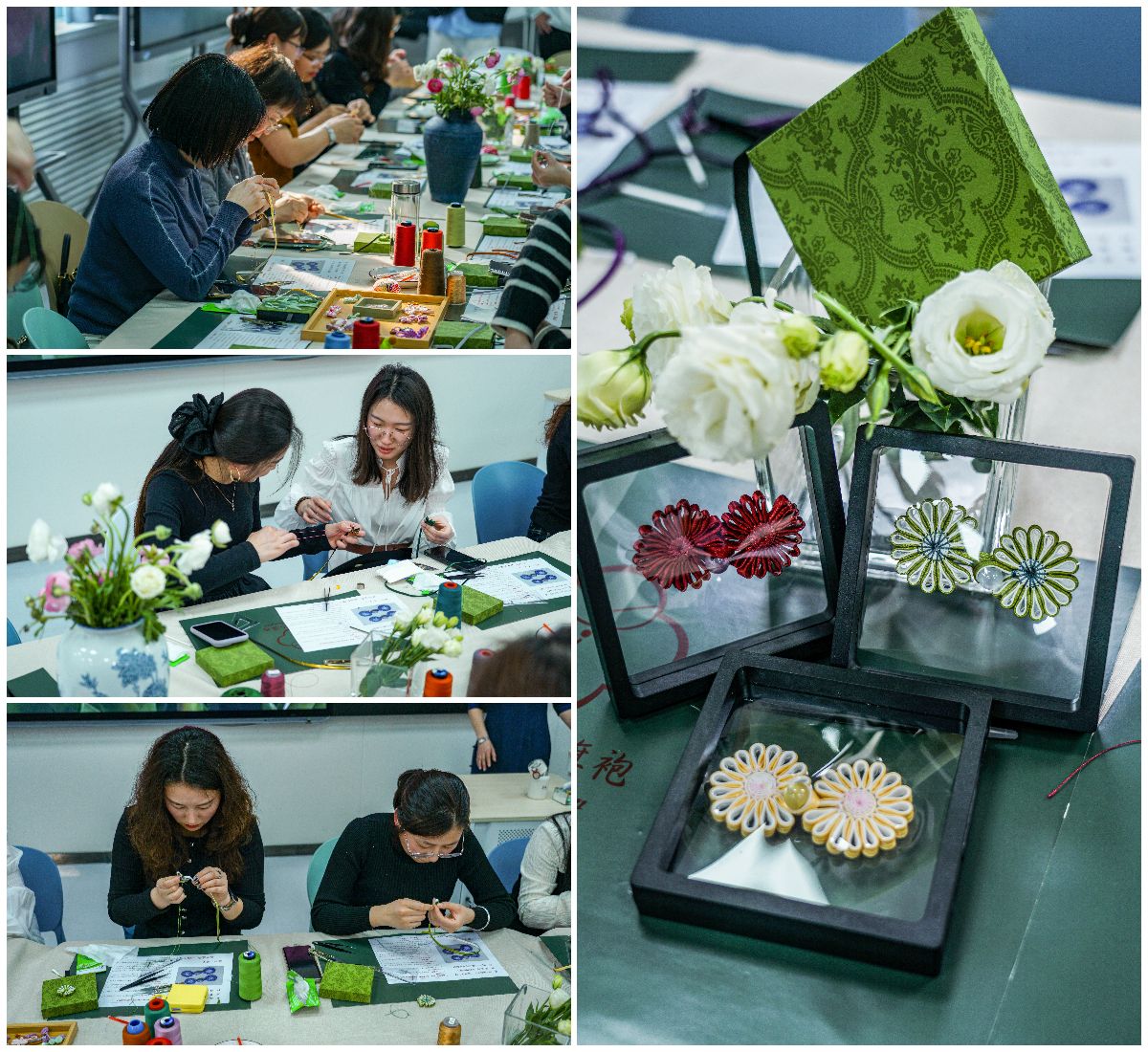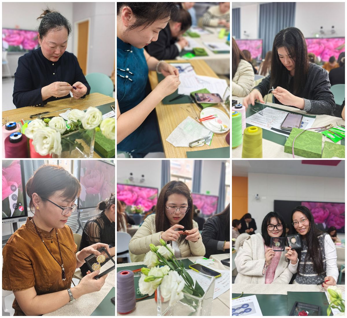 在非遗手作体验环节,教师们个个手持特制工具,在周红老师的指导下沉浸式制作"太阳花"盘扣。金丝银线穿梭间,指尖流转千年技艺的温度。教学秘书赵会燕老师感慨:“一针一线皆是修行,这种专注让我们重新理解工匠精神的内涵。”现场同步展出的旗袍珍品,更让女教师们直观感受传统服饰的东方美学神韵。