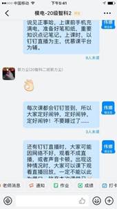 为了与员工们“隔地不隔心”,更快地与同学们熟络起来,建立钉钉群后,她找话题与员工聊天,消除与员工之间的陌生感。并在聊天的过程中,提醒大家线上上课时注意事项。