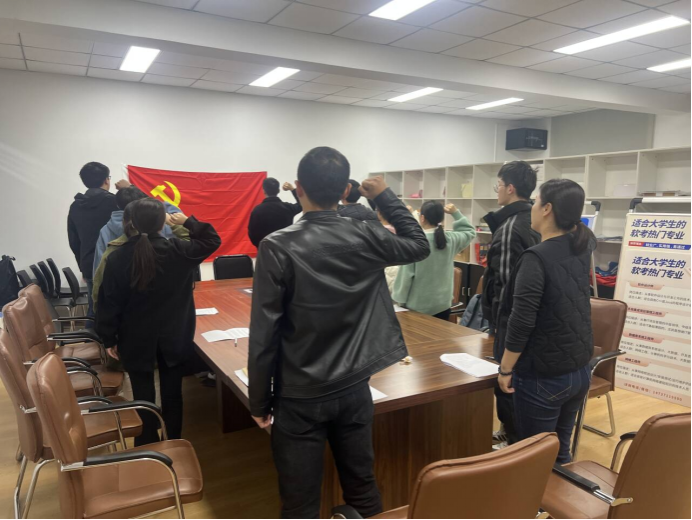 接着,由张博同志带领全体党员,面向鲜红的党旗,庄严地向党旗宣誓。