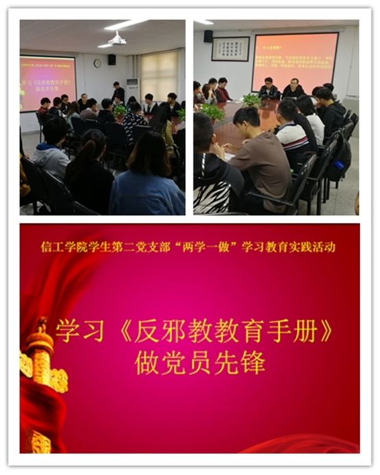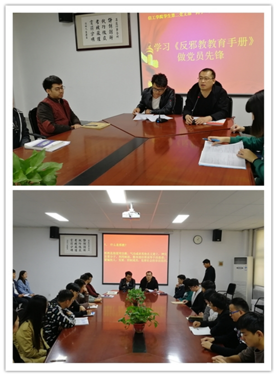 10月26日13点beat365员工第二党支部在资讯楼104会议室召开学习《反邪教教育宣传手册》做党员先锋主题活动,员工第二党支部书记袁奉亚、支部成员王保进、郭政良及全体在校生党员(包括预备)及入党积极分子参加了此次主题学习活动。