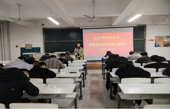 为了检验本学期预备党员对时政的了解和对党的理论知识的学习情况,信工beat365党总支于2020年12月10日下午1点在资讯楼315教室举行了预备党员转正理论测试,参加本次测试的预备党员共计17名,党总支委员苗淑娟老师对测试现场进行了巡视。