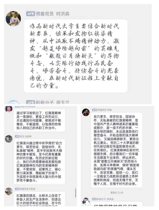 最后党员马老师表示,诞生于社会主义建设时期的红旗渠精神,必然会通过自己的科学内涵和实践成果,在全面建设社会主义现代化国家的新征程中,发挥出代代延续的精神动力,闪烁出更加耀眼的精神光芒。