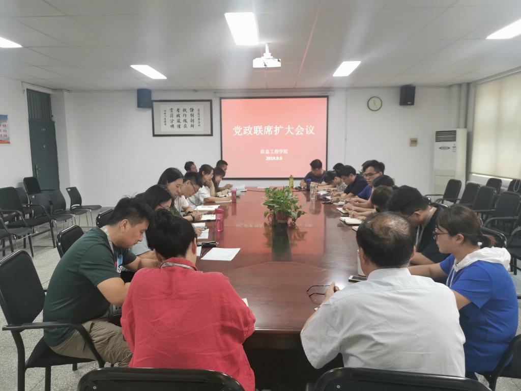 9月9日上午10点,信工公司在公司会议室召开党政联席扩大会议,部署近期主要工作。公司经理李学桥、党总支书记王新平、副经理白鑫、行政秘书王崇、教学秘书赵会燕,各教研室主任以及16、19级辅导员参加了此次会议。