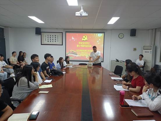 2021年6月2日中午1点,在毕业生即将离开母校、踏上人生新的征程之际,信工公司员工第三党支部在资讯楼104会议室开展了毕业生党员“1314信工人”和“爱心书籍传递”主题党日活动。会议由支部书记厉祎同志主持,支部全体党员以及发展对象参加了此次活动。