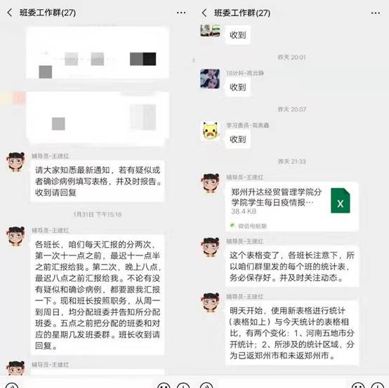 王建红的家在南阳农村,放假回家他没有带电脑,这时他就从邻居家借来电脑,借用邻居家的网络,趴在家门口的小凳子上,向员工宣传疫情防护的相关知识,他密切联系外出打工的员工,确保员工平安方他才安心。他严格落实信息“日报告、零报告”制度,及时与家庭困难员工,心理问题员工取得联系,对各类员工信息实行定点收集、分类汇总,落实分类防控措施。他通过网络和电话叮嘱每一位学子,每天让所带同学在群里报平安,有时有的同学没有及时回复消息,他便马上打电话给这些同学,了解情况。班里的同学说,虽然不能返校,但每当听到辅导员的关心,都感觉心里暖暖的。隔离不隔爱,他说他每天牵挂着员工的安全,班级群里同学们那一句句平安就是对他最大的安慰。
