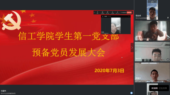 2020年7月3日上午9点信工公司员工第一党支部通过钉钉会议视频召开党员发展大会,本次会议由苗淑娟老师主持,该党支部全体党员、预备党员及发展对象参加此次会议。