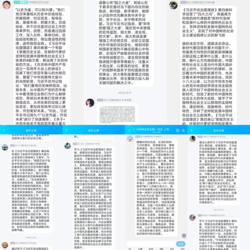 此次学习形式不同以往,先由员工代表学习归纳后,将学习资料和笔记分享给支部成员,并领学了部分内容,在学习活动开展后,党支部成员也在支部群内进行了热烈的讨论,对《习近平谈治国理政》第四卷中的科学回答“四大之问”、《实现中华民族伟大复兴必须坚持斗争精神》、“十个明确”等相关内容有了深刻的认识,并针对学习内容积极踊跃发表学习感想与个人体会。