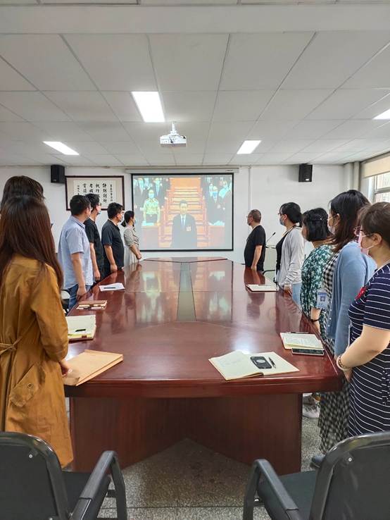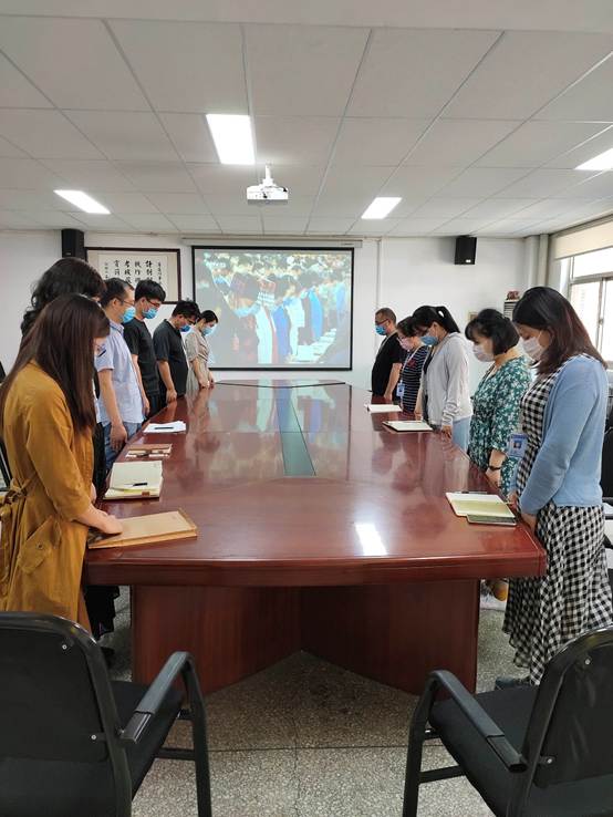 当国歌响起,全体参会人员站立行注目礼,并为抗击新冠肺炎疫情牺牲烈士和逝世同胞默哀。