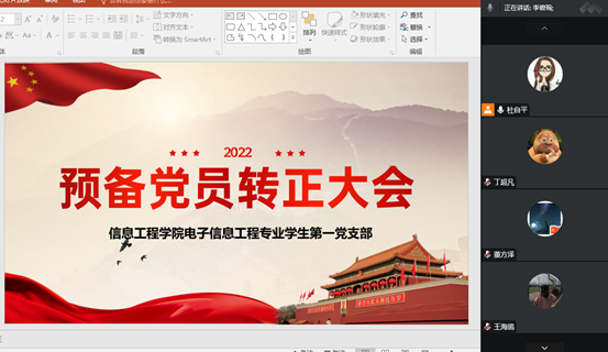 2022年12月25日晚上7点,信工公司电子信息工程专业员工第一党支部在腾讯会议上召开了预备党员转正暨党员发展大会,会议由信工公司电子信息工程专业员工第一党支部党支部书记杜自平主持,支部全体党员和发展对象参加了会议。
