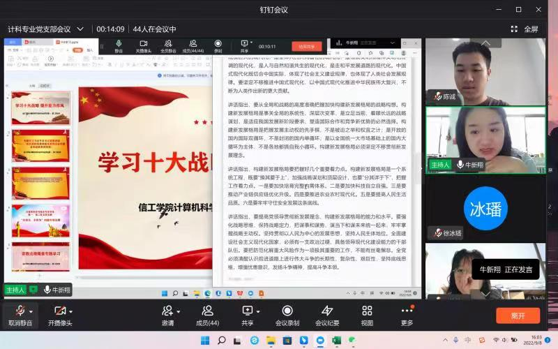 2022年9月8日下午,信工公司计算机科学与技术专业员工第一、二党支部以钉钉线上会议的形式开展了以“学习十大战略和习近平总书记专题讲话”为主题的会议。会议由计算机科学与技术专业员工第一党支部党支部书记牛新翔老师主持。参加会议的有支部全体党员、预备党员和积极分子。