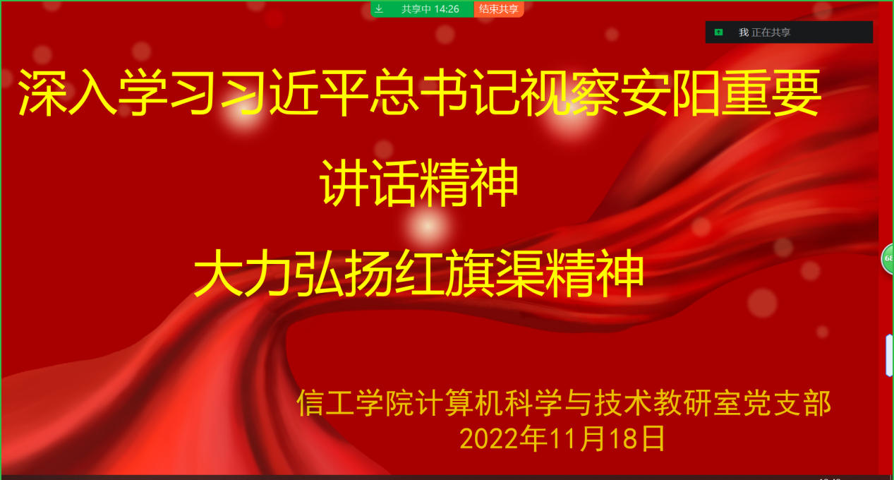 11月18日,计算机科学与技术教研室党支部全体党员教师通过腾讯视频开展了“深入学习习近平总书记视察安阳重要讲话精神,大力弘扬红旗渠精神”为主题的组织生活会,会议由党支部书记王天顺老师主持。