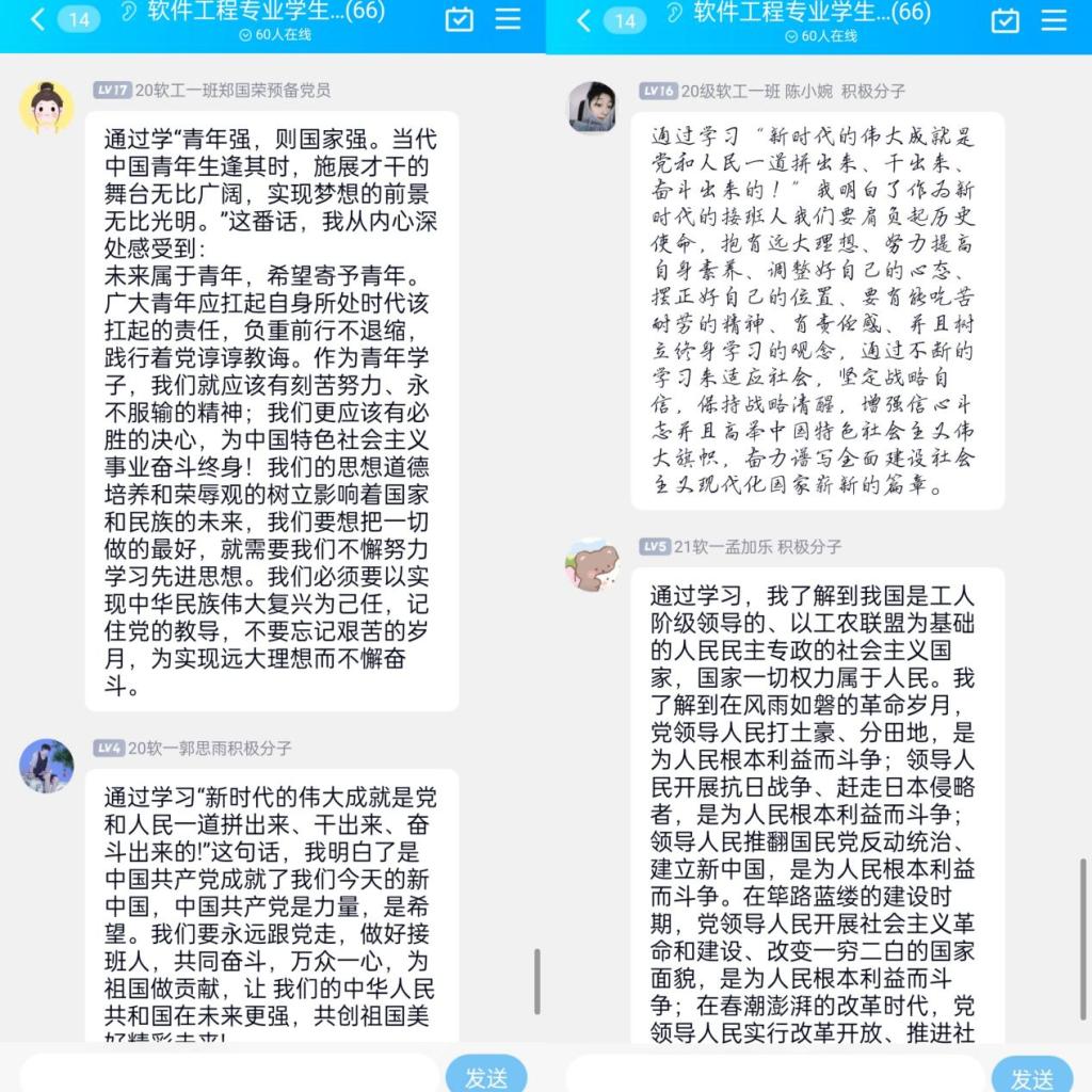 支部师生自己找寻资料,学习党的二十大报告中的“金句”,之后在党支部群内一起讲心得、说体会、话未来。“当代中国青年生逢其时,施展才干的舞台无比广阔,实现梦想的前景无比光明。”“广大青年要坚定不移听党话、跟党走,怀抱梦想又脚踏实地,敢想敢为又善作善成......”这些金句激励着支部师生持续奋斗,勇往直前。