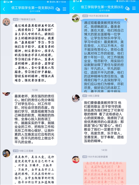 一幕幕画面历历在目,感人至深。面对新冠肺炎疫情防控这场没有硝烟的战斗,正是因为有了老师们的辛勤付出,才保障了员工们在疫情期间停课不停学,“最美教师”的时代新形象展现了教育工作者以实际行动助力打赢新冠肺炎疫情防控阻击战、教育脱贫攻坚战的精神风貌。师生们通过收看启动仪式及事迹展播,纷纷在线上分享自己的观看心得,要以最美教师为榜样,开拓创新,奋发进取,把疫情当教材,与祖国共成长。