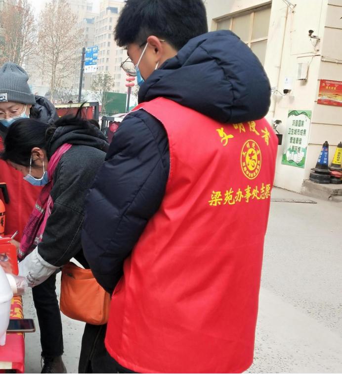 在开封市金耀社区在有条不紊地安排起防疫工作后,身为团员的王康博同学决定参加防疫志愿活动。此次疫情的志愿工作主要是在小区门口及街道口执勤,对来往人员进行登记,并且测量体温,在做好自身安全防控的情况下,提醒群众佩戴口罩,对所有进出人员进行体温测量、信息登记,发现外来人员及时协助社区采取报备登记,由医护人员进行检查,降低传染可能性,为家乡的防疫工作贡献自己的一份力量。