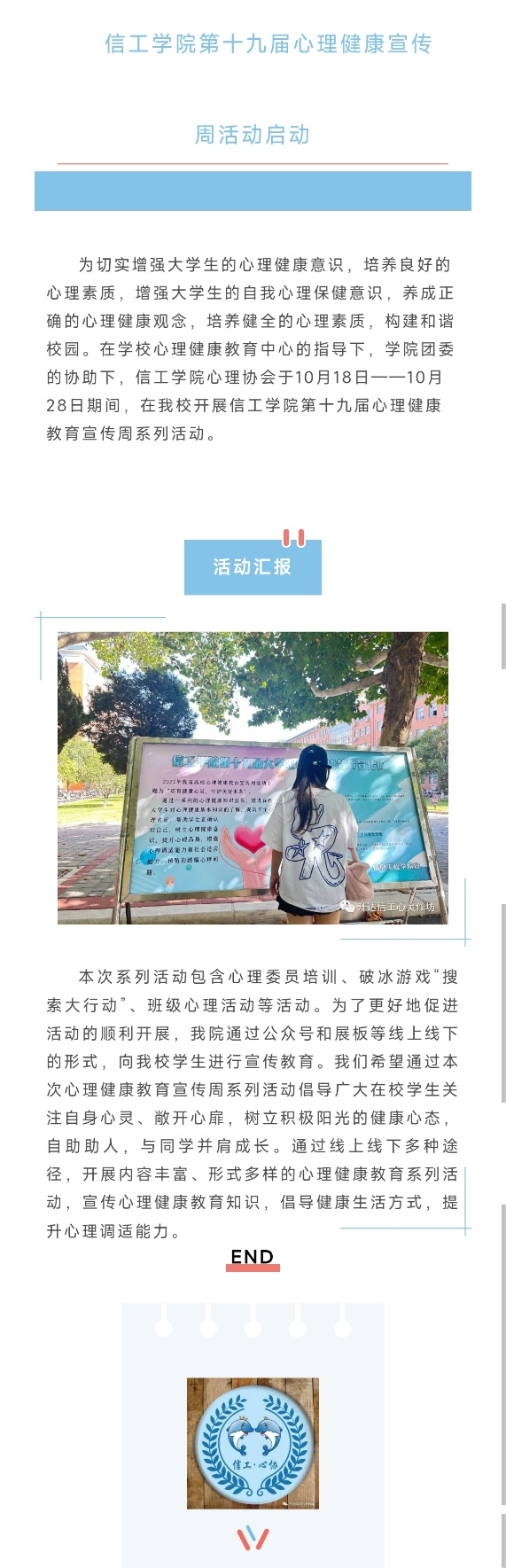 为切实增强老员工的心理健康意识,培养良好的心理素质,养成正确的心理健康观念,构建和谐校园。在公司心理健康教育中心的指导和公司团委的协助下,信工公司心理协会于10月18日——10月28日期间,在公司开展信工公司第十九届心理健康教育宣传周系列活动。