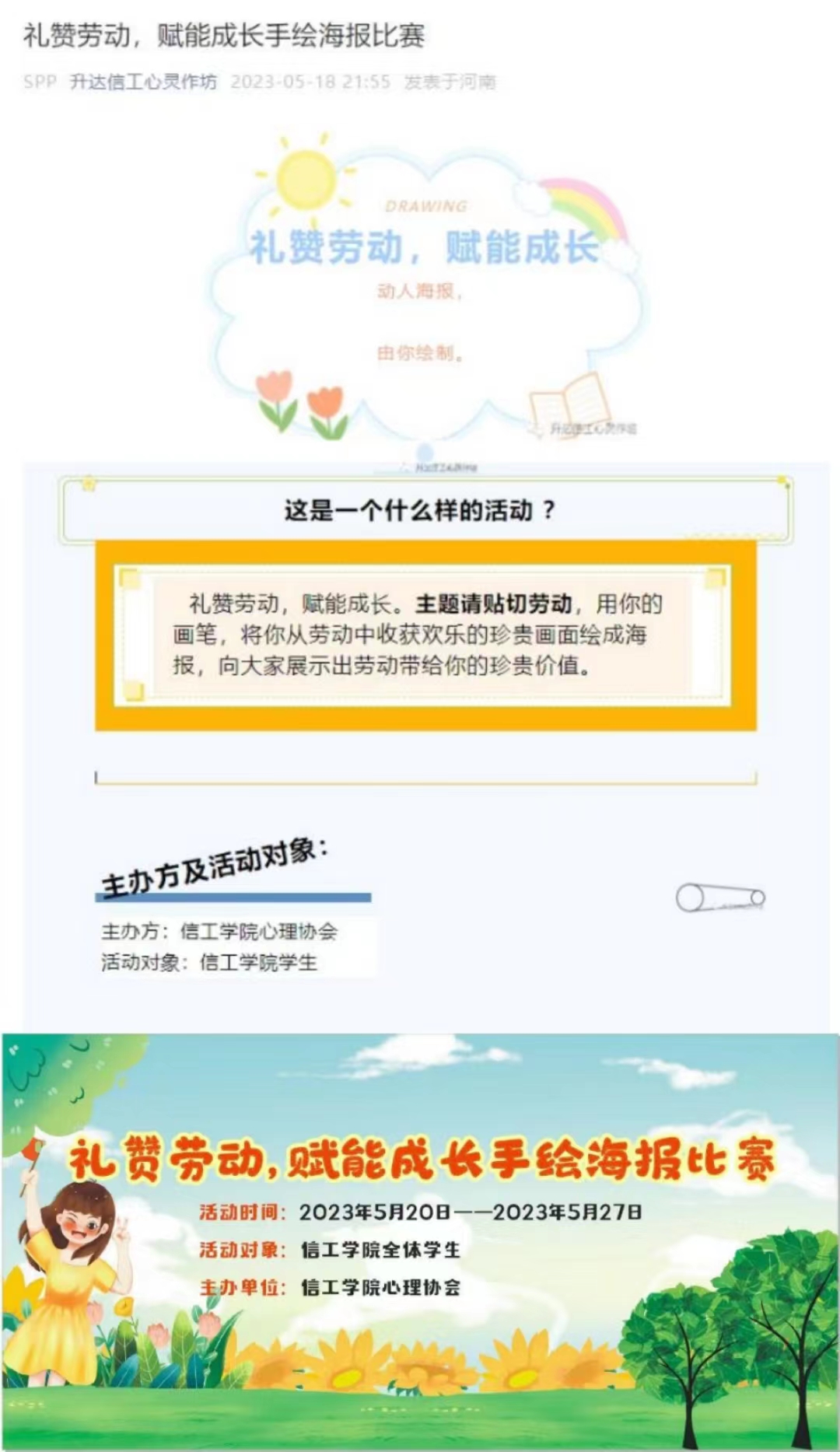 2023年5月20日至5月27日,信工公司心理协会开展“礼赞劳动 赋能成长”手绘海报征集活动。