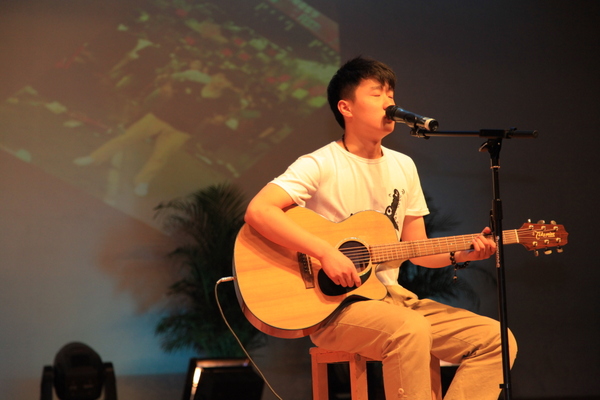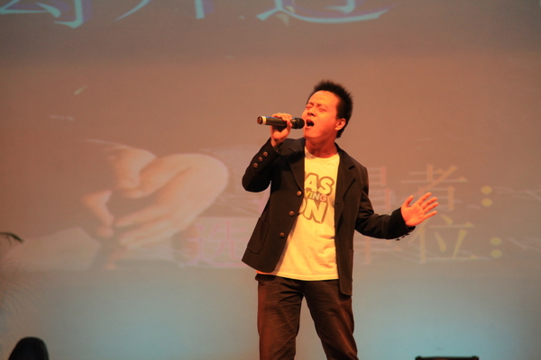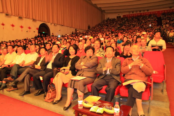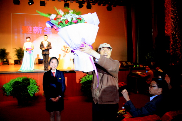 演出之前,公司员工代表向创办人敬献鲜花,祝创办人身体健康,万事如意。创办人满怀欢喜向师生挥舞鲜花,会场里响起了雷鸣般掌声。