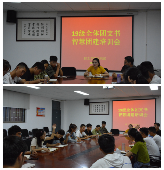 2019年9月24日下午5:30,信工公司在资讯楼104会议室为2019级团支书进行了一次“智慧团建”工作的培训。信工公司团委组织部部长成菁华,组织部副部长王新、刘晨宇、付子奇以及19级各班团支书参加了本次会议。