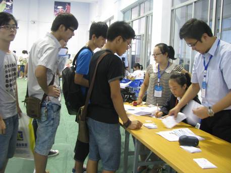 大家以优质的服务去迎接新生,耐心地与家长沟通,为家长及时安排座位休息,带领着13级新生穿梭于缴费、报名登记、领取饭卡、购买校服等新生办理手续必经的各个地点。所有人对每一个细节都精益求精,在效率和质量两不误的情况下顺利完成任务。即使一个个都大汗淋漓,也毫无抱怨 。整个迎新工作中,继续保持迎接专升本新生的务实 、高效、热情的工作作风赢得了好评,再次展现了良好的道德素质。系主任李学桥教授和总支魏民书记也在百忙之中前来指导慰问,给工作者们莫大的鼓舞,使迎新工作进行的井然有序。
