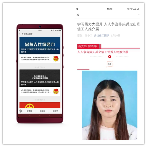 为了更好的引领广大青年继承和发扬五四精神,实现中华民族伟大复兴的中国梦而努力奋斗,帮助和带动公司青年团员在活动中坚定理想信念,树立远大志向,提升个人综合素养。信工公司团委特于2019年5月27日开始进行“学习能力大提升 人人争当排头兵之”之“出彩信工人”事迹材料微信推介展。