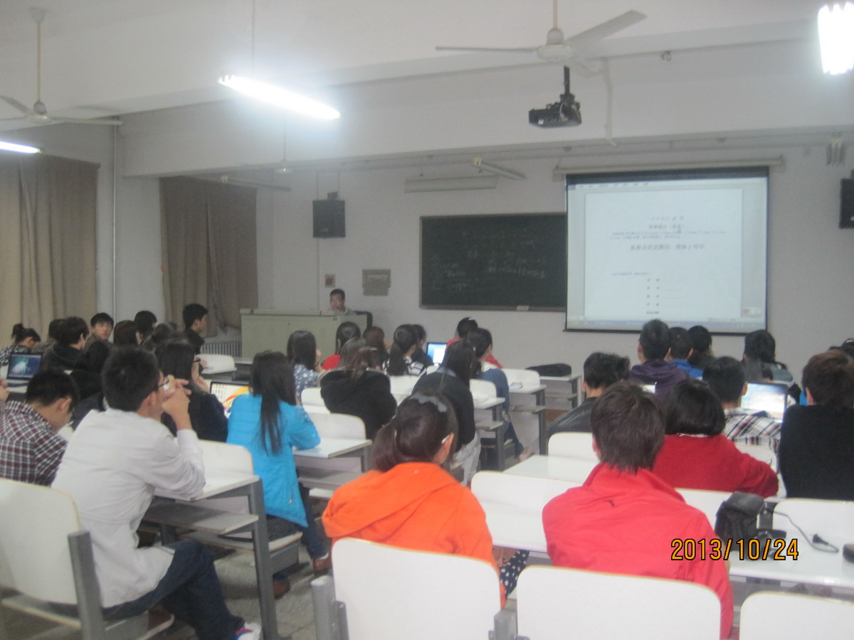 首先,王渊博以“大学论文”为样本,介绍了封面设计的要求、内容格式、字体等说明。然后,对文章的打印、操作方法与所需的注意事项进行了详略得当的阐述。而后又以新生开学各类宣传页为范例,向大家展示图片的插入、移动和字体的变换,并就此强调设计所需的耐心与细心。随后,触动人心的PPT幻灯片吸引了大家的眼球。画面动静结合,一幅幅连贯整齐,如同动漫视频一般精彩。他谈到ppt制作过程最重要的是选材、充分准备、衔接连贯,这是一部好作品的成功关键。他鼓励大家去勤于动手,尝试一些简单的制作。最后讲解了EXCLE表格的设计,强调了实际的规范性,并针对常见的错误进行了提醒。