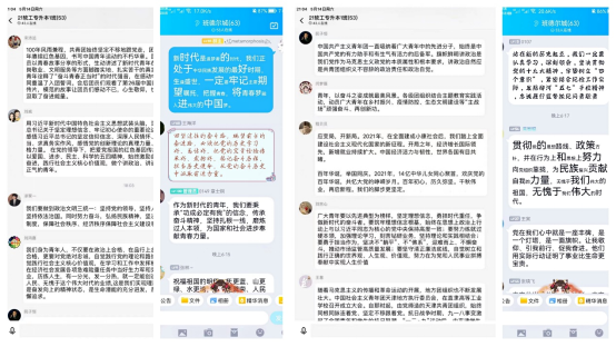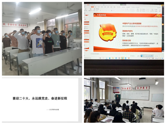 5月11日至5月16日之间,各班团支部又通过线下的各种形式重温入团誓词,更加紧密地团结在以习近平同志为核心的党中央周围,坚定不移听党话、跟党走,与时代同步伐,与人民共命运,在激扬青春、开拓人生、奉献社会的进程中书写无愧于时代、无愧于历史的青春篇章,以实际行动迎接党的二十大胜利召开。