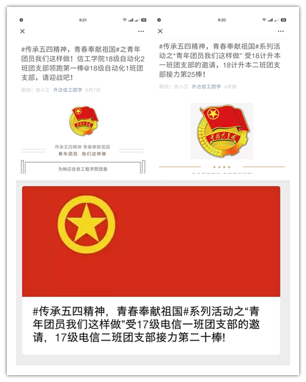 活动期间,各班团支部积极组织班级同学开展“传承五四精神,青春奉献祖国”主题班会,班会上,各班团支书带领大家学习“五四精神”,并通过观看习近平总书记在“纪念五四运动100周年”大会上的重要讲话影视片段,让同学们进一步认识和体会五四运动的性质以及它所孕育的精神。与此同时,各个班团支部以接力形式在信工公司微信官方公众号上推送学习心得体会等,以带动更多的青年团员学习“五四精神”。