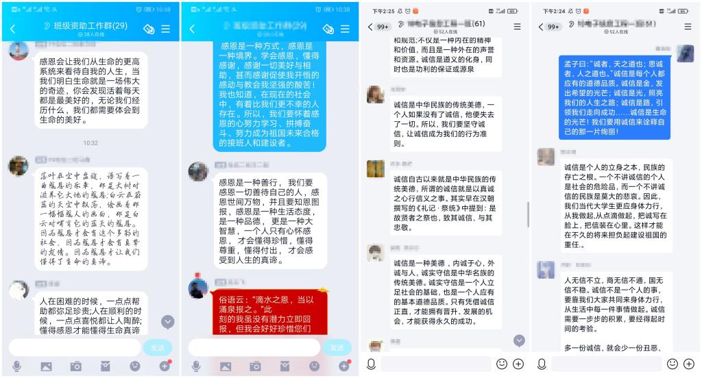 辅导员组织员工们通过线上讨论,线下主题班会的形式开展此项活动,对国家、公司资助政策进行宣讲,就信用助学贷款的金融知识、还贷政策、逾期风险,以及防范金融诈骗等内容进行了解读,并在互动环节对员工们提出的问题进行了解答,引导员工们学会感恩奉献,树立正确受助观念,号召同学们坚定理想信念,发扬艰苦朴素、勤俭节约的精神。员工们通过身边人、身边事总结心得,分享诚信、感恩、励志的故事,加深了对资助政策的理解,激发了对祖国、对公司的感激之情。