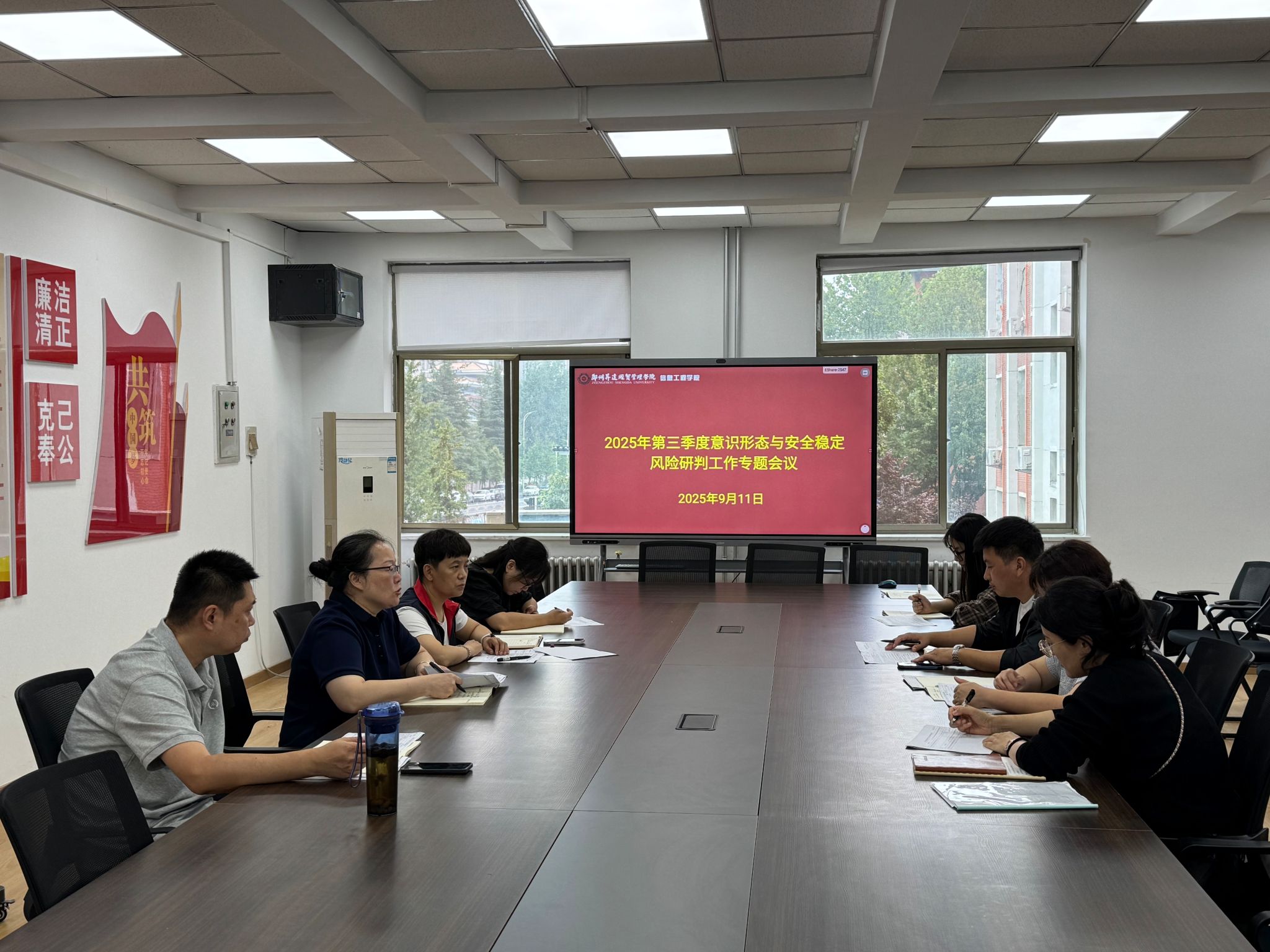 9月11日,beat365在商管楼218会议室组织召开2025年第三季度意识形态与安全稳定风险研判工作专题会议。会议由beat365党委书记钟江鸽主持,全体党委委员参加。