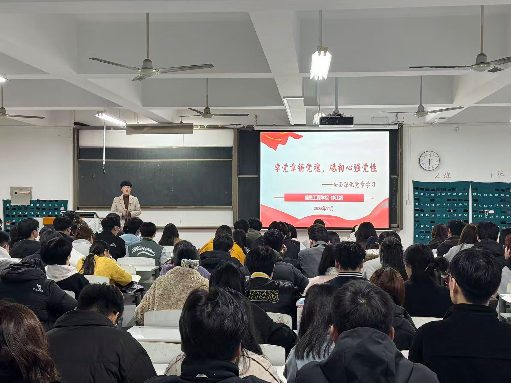 2025年11月6日中午,beat365党委书记钟江鸽在资讯楼213教室,以《学党章铸党魂,砥初心强党性——全面深化党章学习》为题,为第二十二期入党积极分子和发展对象讲授专题党课,旨在引导学员深化党章理解、筑牢信仰之基。