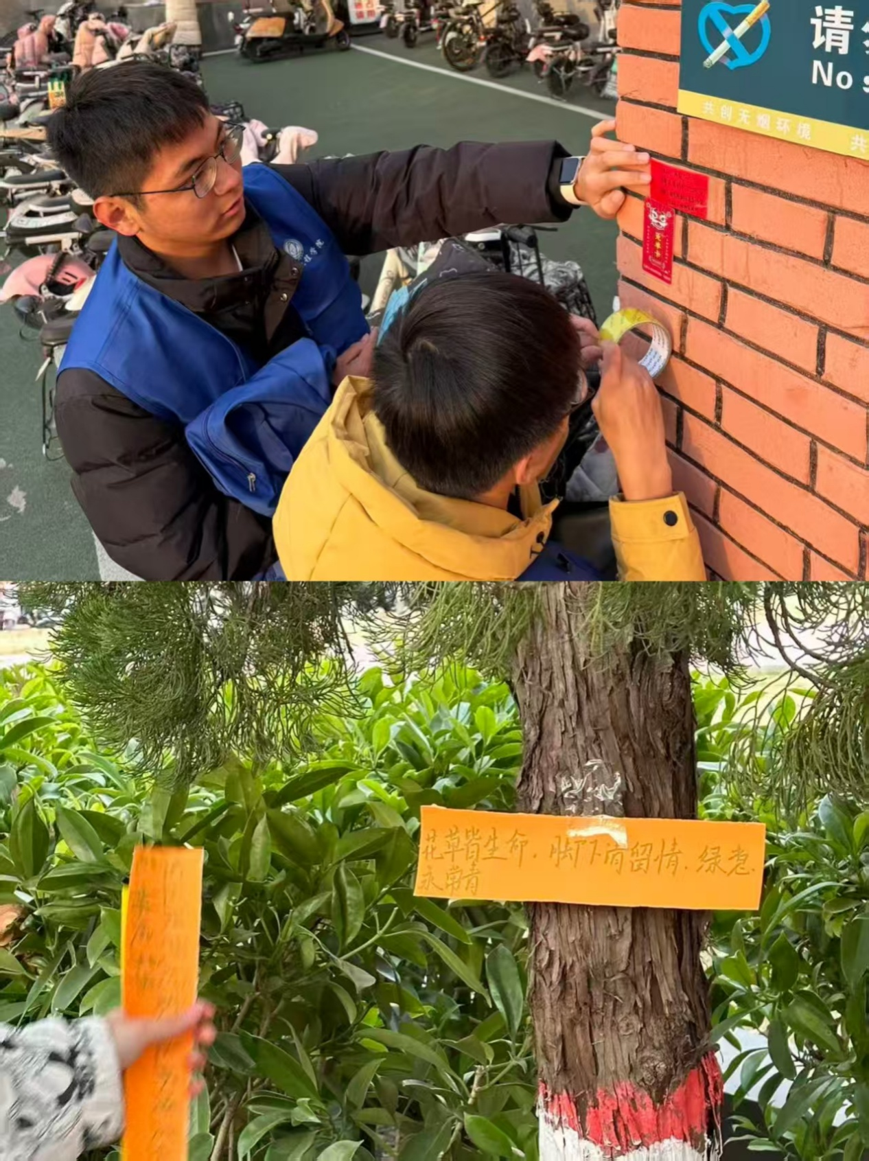 活动当天,志愿者们分为3-4个专项小队,携带提前准备好的海报、胶带、抹布等工具,有序前往各重点区域开展工作。在张贴海报过程中,志愿者们严格把控张贴位置与规范,确保海报整齐美观、不遮挡原有通知,同时主动清理张贴区域周边的灰尘与杂物,做到“张贴一处、清洁一处”。面对过往师生的咨询,志愿者们耐心讲解海报内容,普及卫生清洁与环保知识,传递文明校园建设理念,展现了青年学子的责任与担当。